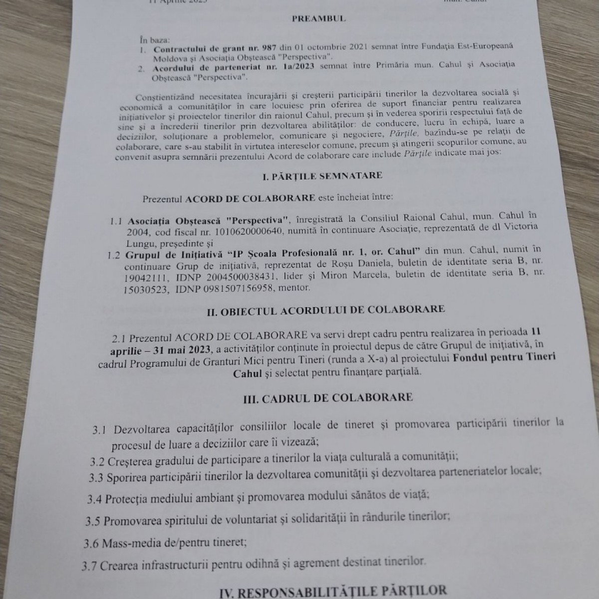 Acordul de colaborare, încheiat la 11.04.23, între AO,, PERSPECTIVA"-Proiectul "Granturi mici pentru tineri 2023" va susține logistic și metodologic îmbunătățirea condițiilor de trai al elevilor din căminele instituției.